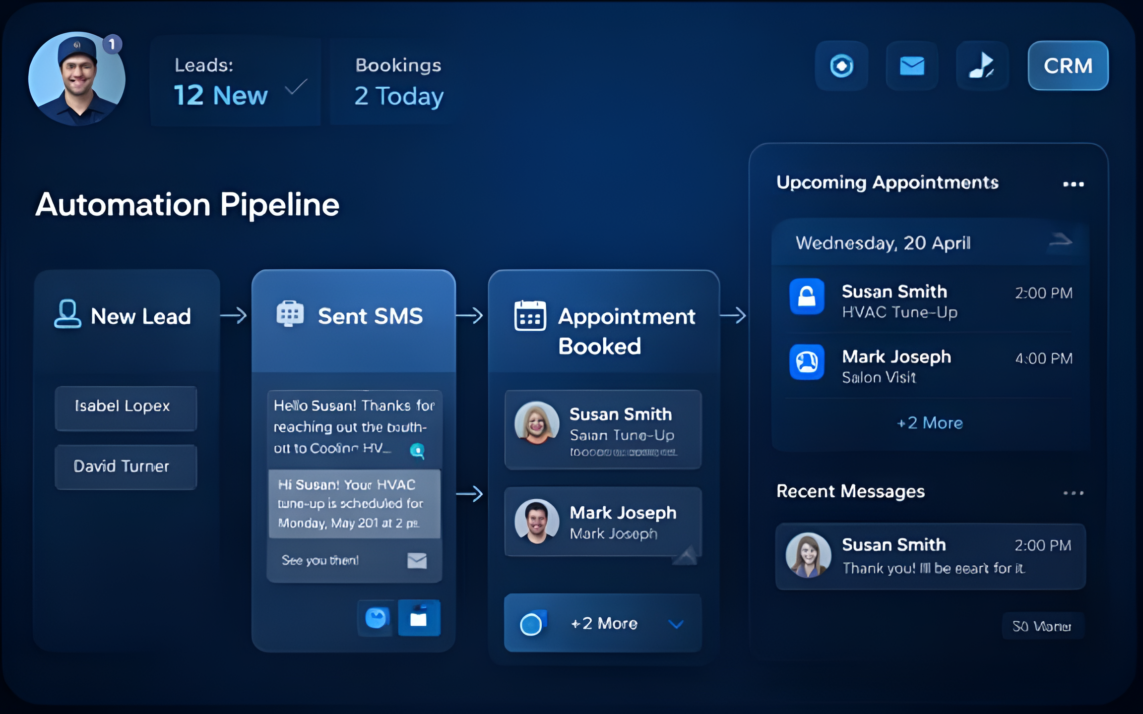 All your leads, conversations, appointments, and deals in one powerful CRM—so nothing slips through the cracks and every opportunity is tracked.